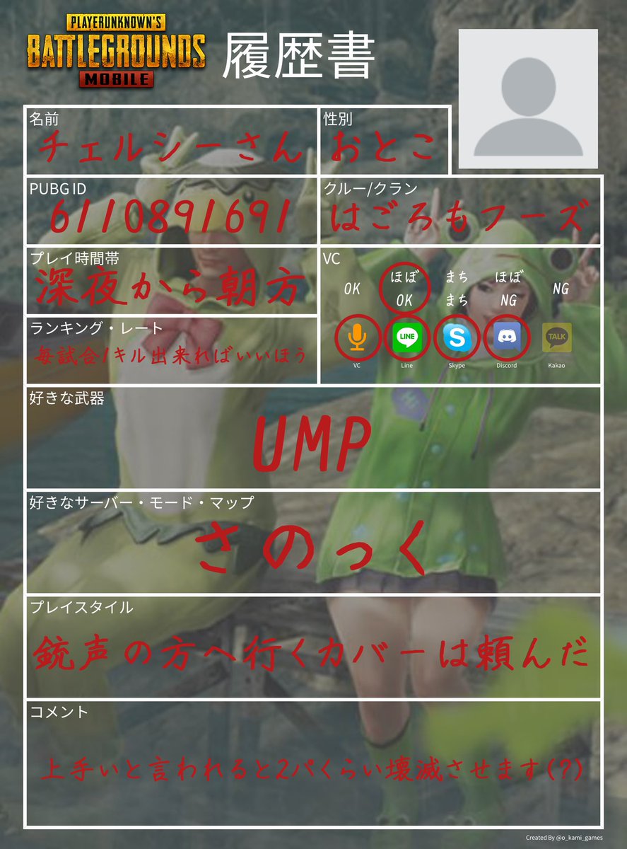 笑撃のこーや オーカミさん O Kami Games の履歴書ジェネレーターで作りました 基本野良 でやってるのでたくさんフレンドが欲しいです Pubgモバイル Pubg Mobileしてる人と繋がりたい Pubg Mobile Pubgエンジョイ勢 Pubgフレンド募集
